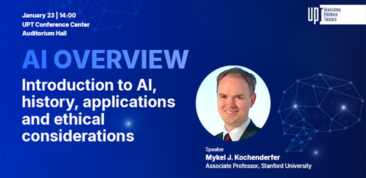 Mykel J. Kochenderfer (Stanford University) vine în premieră în România la Universitatea Politehnica Timișoara. Este profesor asociat în cadrul Departamentului de Aeronautică și Astronautică și Director al Stanford Intelligent Systems Laboratory (SISL), unde dezvoltă algoritmi și metode analitice pentru proiectarea sistemelor robuste de luare a deciziilor.